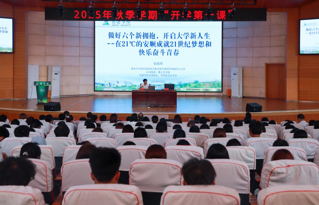 2025年9月8日上午,南开大学现代旅游业发展省部共建协同创新中心主任、A1岗教授、博士生导师、安顺学院名誉校长石培华,安顺学院党委书记程绪权、校长曾丽在学术报告厅为全校师生代表700余人讲授2025年秋季学期“开学第一课”。曾丽主持授课。